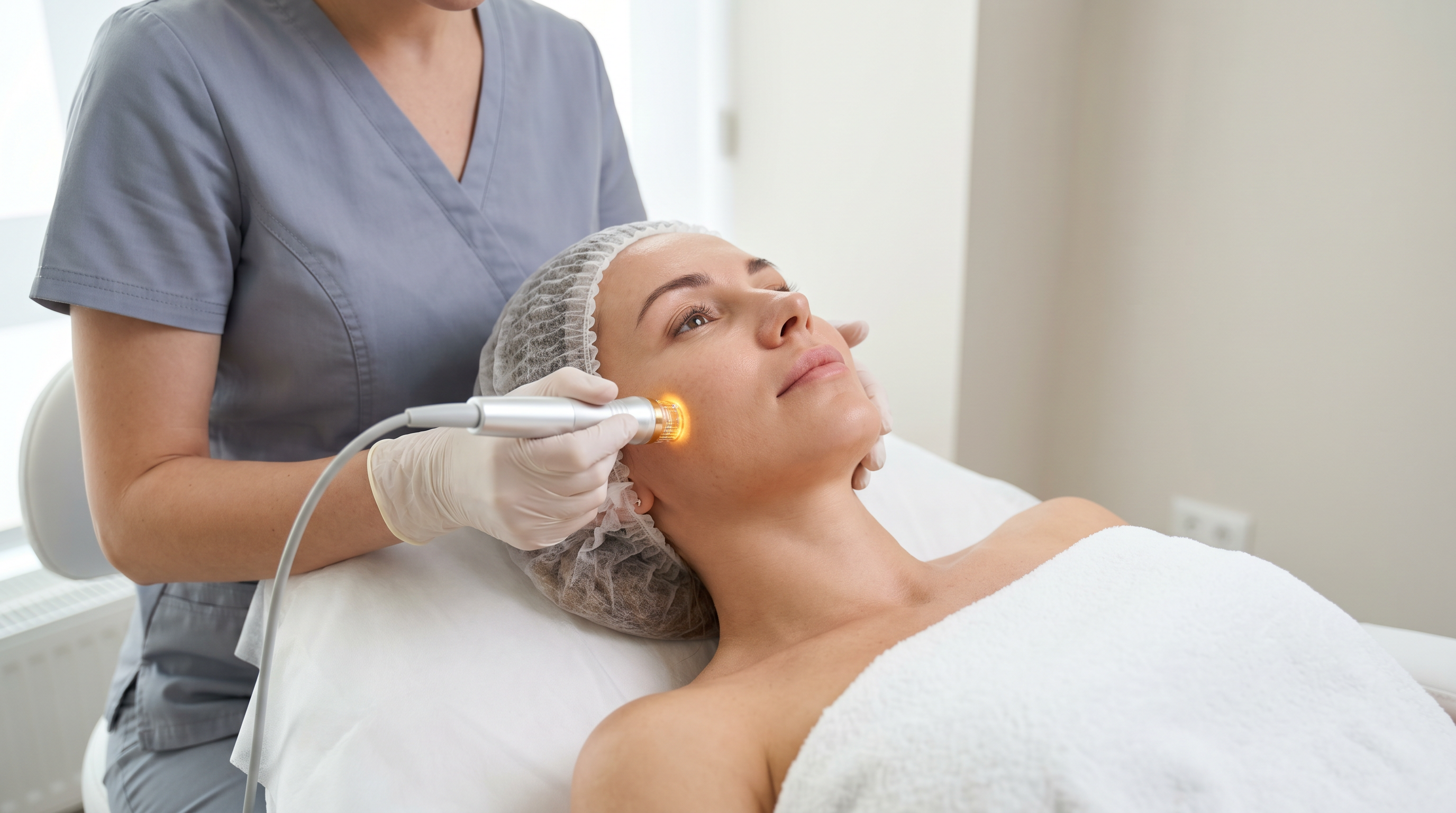 В день процедуры пациент приходит с чистой кожей, без макияжа. Кожа очищается специальным средством, после чего наносится аппликационный анестетик (лидокаин- или прилокаин-содержащий крем или гель). Экспозиция анестетика при MRF составляет, как правило, 45–60 минут — заметно дольше, чем перед инъекционными процедурами, поскольку воздействие более интенсивное. Правильная и достаточно длительная анестезия — ключевой фактор комфорта пациента.